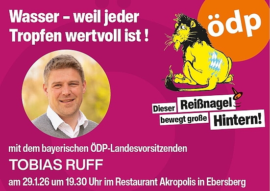 mit dem ÖDP-Landesvorsitzenden Tobias Ruff am Donnerstag, dem 29.1.2026 um 19.30 Uhr im Restaurant Akropolis, Heinrich-Vogl-Str. 2 in Ebersberg. Tobias Ruff macht darauf aufmerksam, wie Wasser teils verschwendet, entwertet oder einfach entsorgt wird. Und er zeigt vor allem, wie wir das kostbare Gut schützen können. Der Eintritt ist frei. Außerdem sammeln wir Unterschriften dafür, den Trinkwasserschutz als Staatsziel in die die Verfassung aufzunehmen.